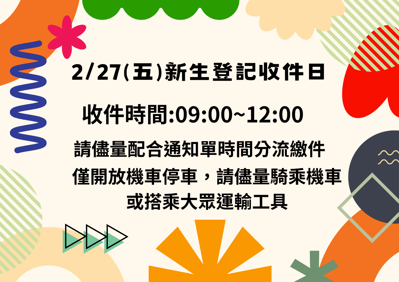 2/27(五)新生登記日收件日,收件時間9:00-12:00,請配合時間分流繳件。